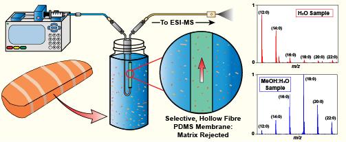 Fatty Food security and authenticity are becoming important areas of analytical science, as is nutritional analysis.  Fatty acid composition, especially the essential fatty acids, requires time consuming sample preparation steps and lengthy analytical measurement times.  We have developed a rapid, quantitative fatty acid measurement strategy based upon CP-MIMS that exploits the use of modified donor (sample) phases to allow direct measurements in complex fatty samples such as salmon flesh.  The use of mixed solvent donor phases exploits the advantage of CP-MIMS for complex sample measurements, allowing direct determinations in samples such as tissue digests without additional workup. In addition, online cationization reagents such as lithium and barium are proving invaluable for direct identification and quantitation of essential unsaturated fatty acids such as EPA and DHA.